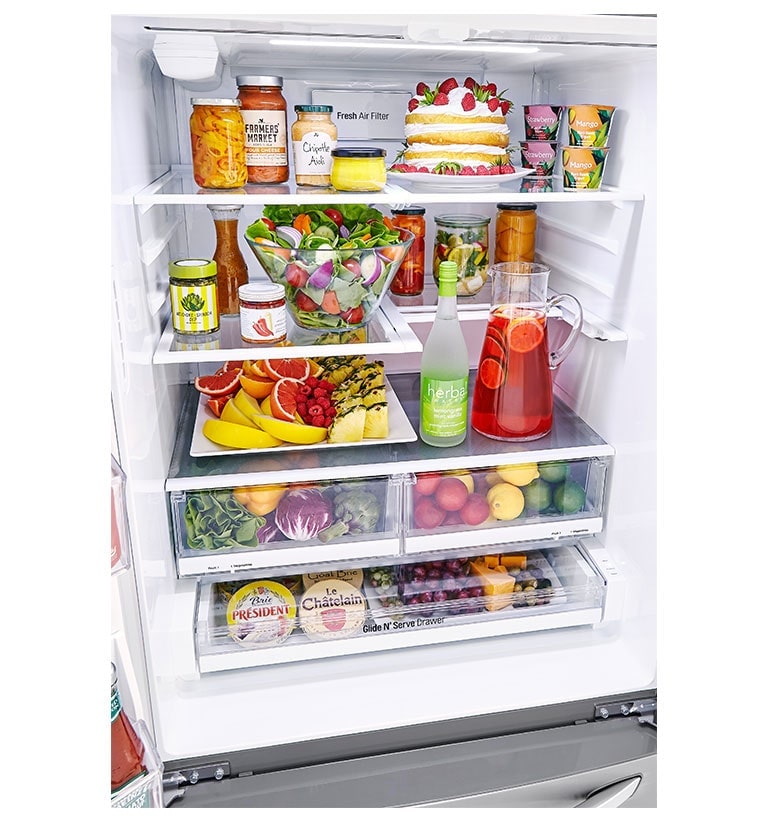 Stock-up and store everything you need. With a cavernous 24 cubic feet of space, this LG French Door refrigerator gives you ample space for all of your family's favorite foods and keeps them conveniently organized and within reach.