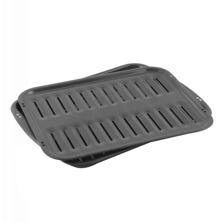 The broil pan set allows you to use your oven’s broil setting effectively. It helps drain excess fat and grease away from food during cooking, resulting in healthier meals and even browning. Over time, broil pans can become warped, rusted, or heavily stained, making replacement necessary to maintain cooking performance and safety.