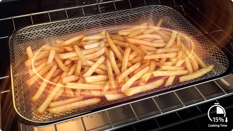 * Based on internal testing. Results may vary depending on the type of food and individual use. While the cooking performance of Air Fry Max and the previous Air Fry mode is comparable, Air Fry Max reduces cooking time by approximately 15% compared to its predecessor. Testing with frozen potato fries, where cooking time decreased from 30 minutes to 25.5 minutes. ** Compared to deep frying.