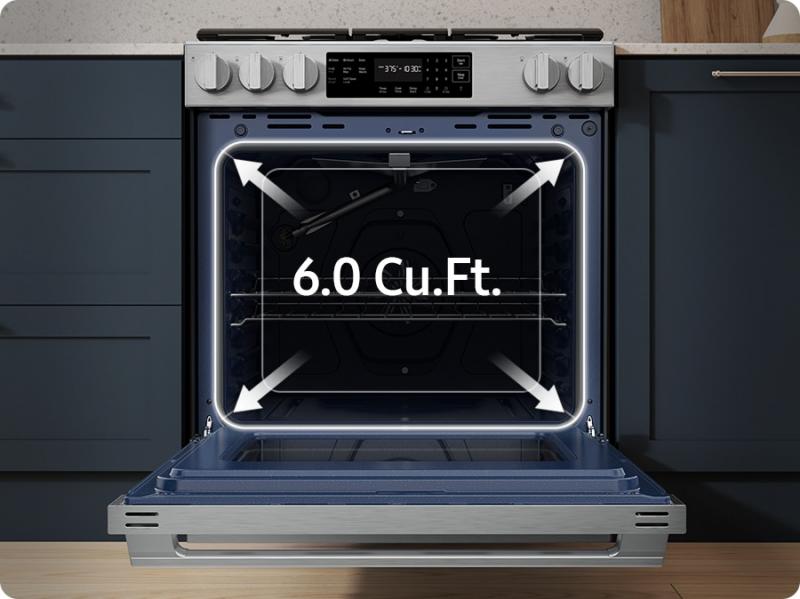 Accommodates large cookware and family-sized meals with a huge 6.0 cu. ft. capacity oven, making it perfect for everyday dinners or entertaining guests. Prepare multiple dishes at once or easily cook large items like a big roast or holiday turkey.
